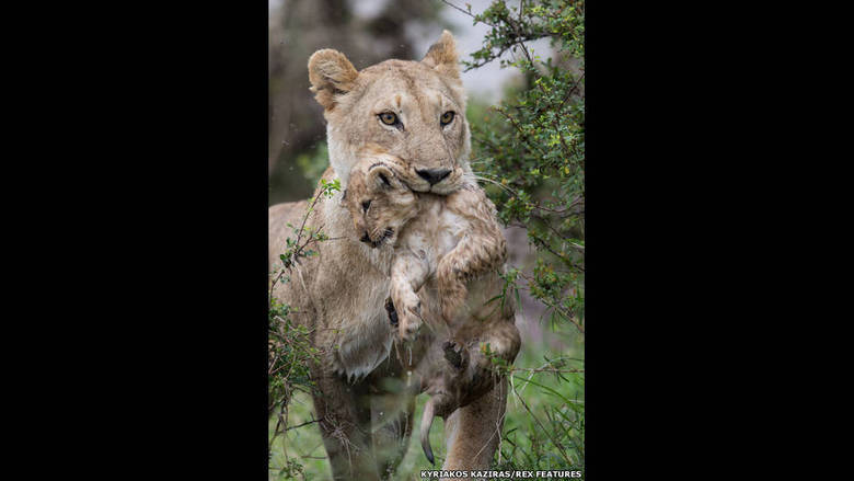 carregando o filhote na boca.