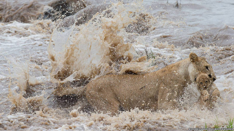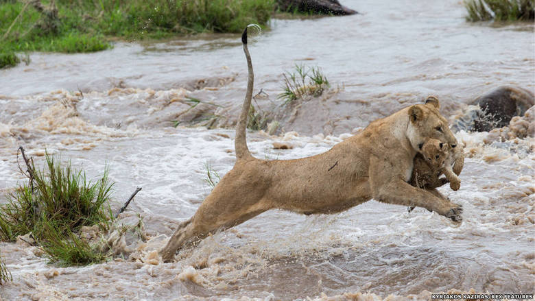 A leoa tentava se juntar ao resto do bando na outra margem